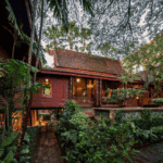 Não era uma residência comum: ele juntou diversos estilos tradicionais de arquitetura tailandesa com a sua visão moderna, criando um conjunto de vilas com telhados pontiagudos. E ele fez isso num lugar cheio de mata da área ao redor.